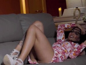 Den Chico-stokken knullet Canela Skins og hun rir sin spanske fitte. Canela Skin legger seg på sofaen og lar hingsten vår dra av henne strømpebuksene i all sin prakt. Hingsten leker litt med dem før hun setter seg på og rir hans chico-stokk. Hun fu