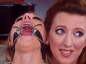 Bundet slave anal knullet i trekant. Spider-gag brunette slave Emma Haize i knebøy-stilling blir halsknullet som slavetrening med hjelp av annen slave Cherry Torn, deretter i trekant soverom bondage anal knullet